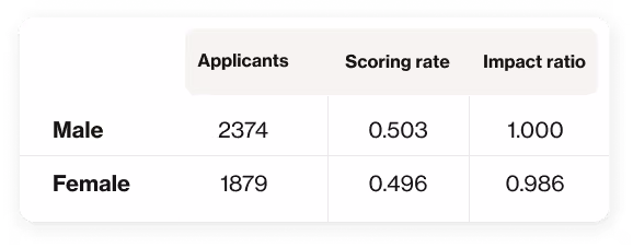 As shown, male candidates have a slightly higher scoring rate than female candidates: 50.3% of males scored above the sample median compared to 49.6% of females. This small difference does not indicate any disparate impact, as reflected in the closely aligned impact ratios.